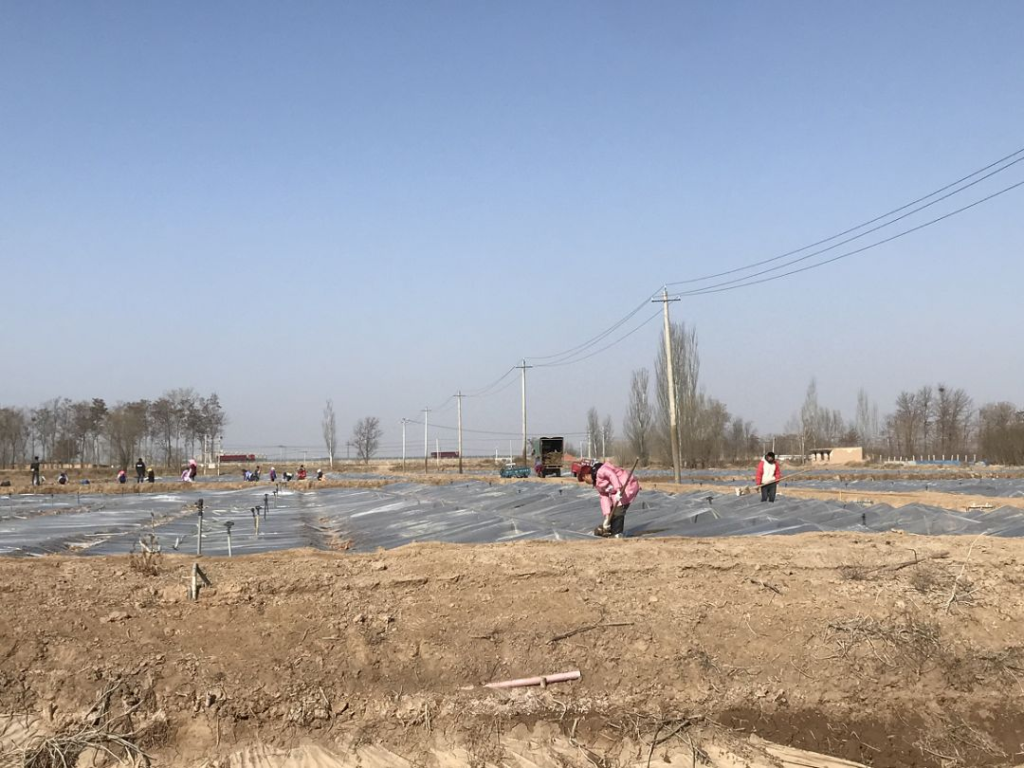 剛剛耕翻過的黝黑的土地上,農民們正在緊張的播種、覆膜。